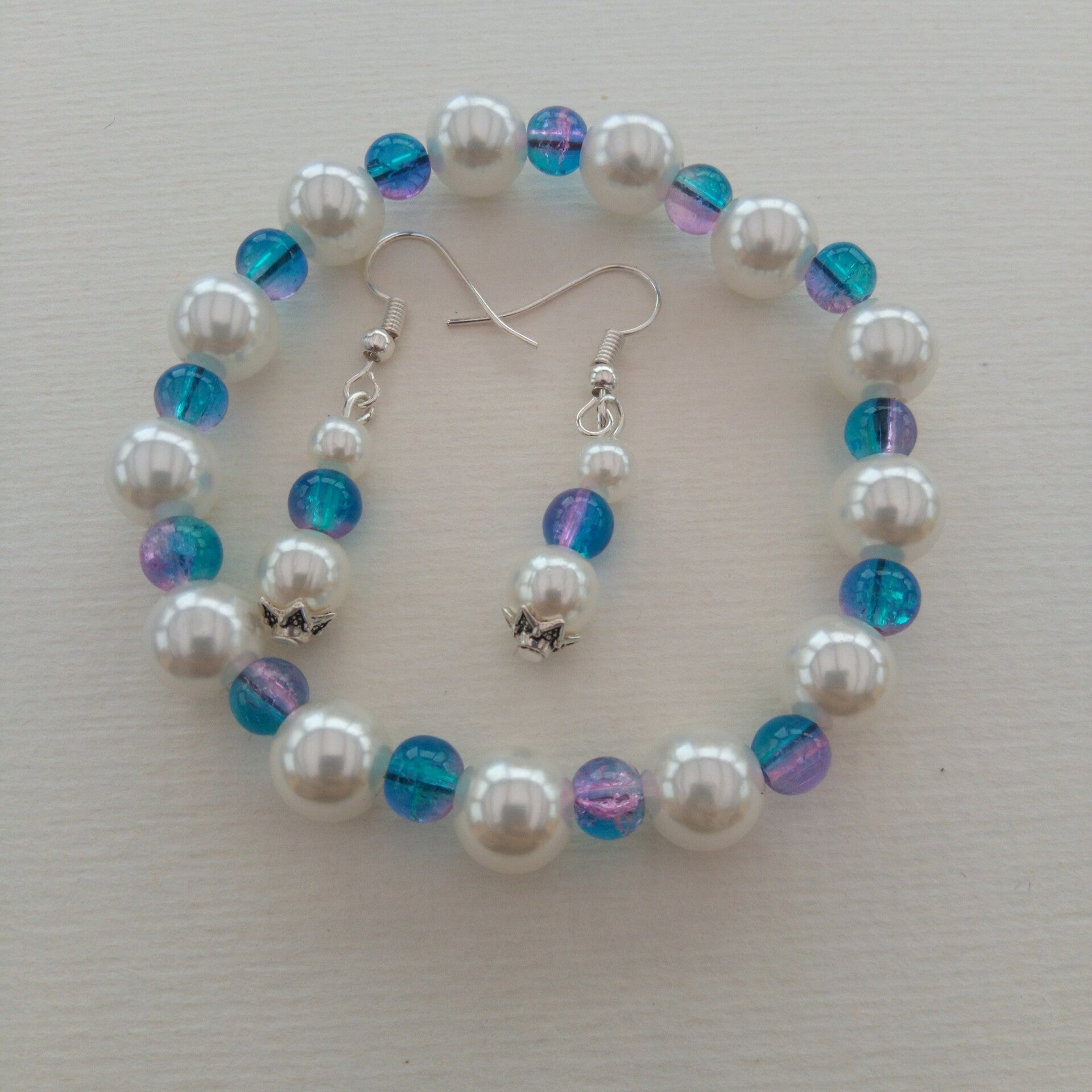 Bracelet élastique taille 23 cm et boucle d'oreille bleu et blanc