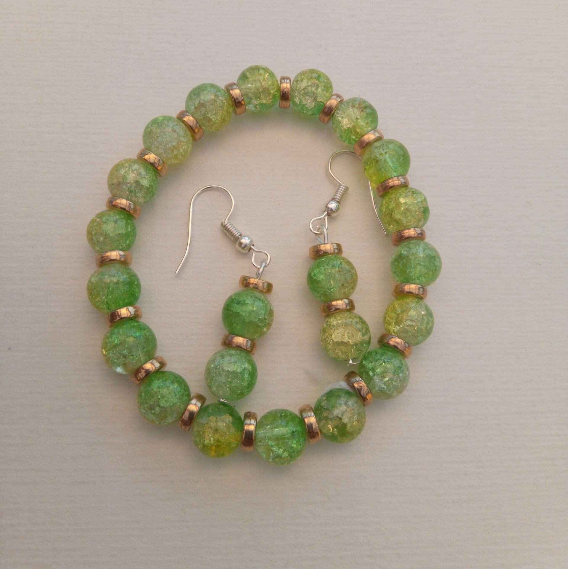 Bracelet élastique taille 19 cm et boucle d'oreille couleur verte perles en verre.