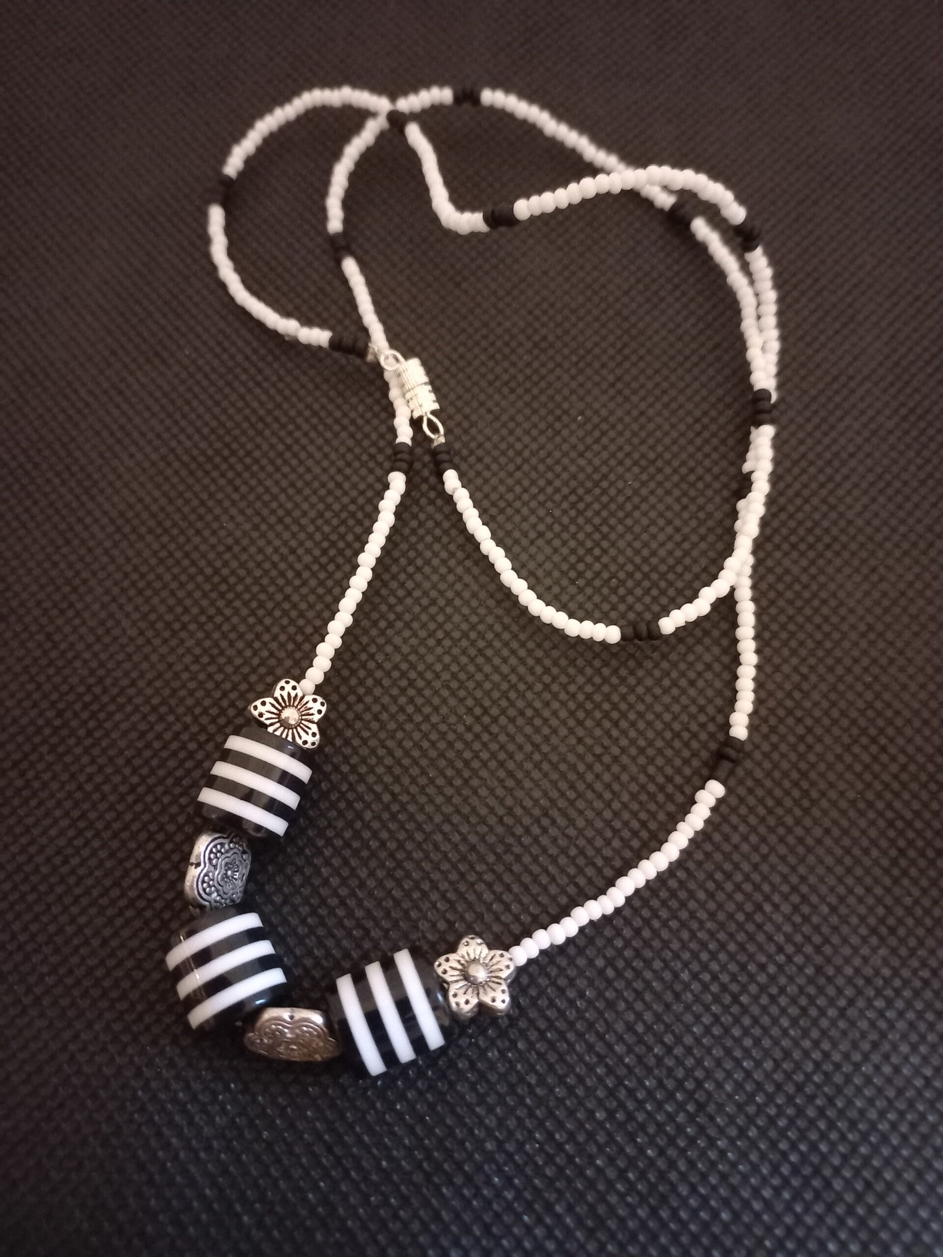 Collier blanc et noir avec charms fleurs en perles synthétique et fermoir.