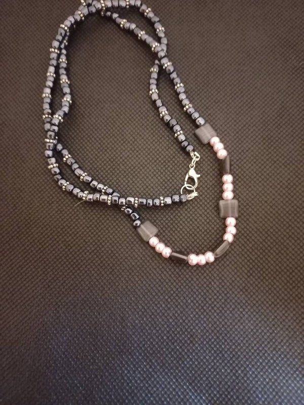 Collier noir et violet en perles synthétiques et fermoir.